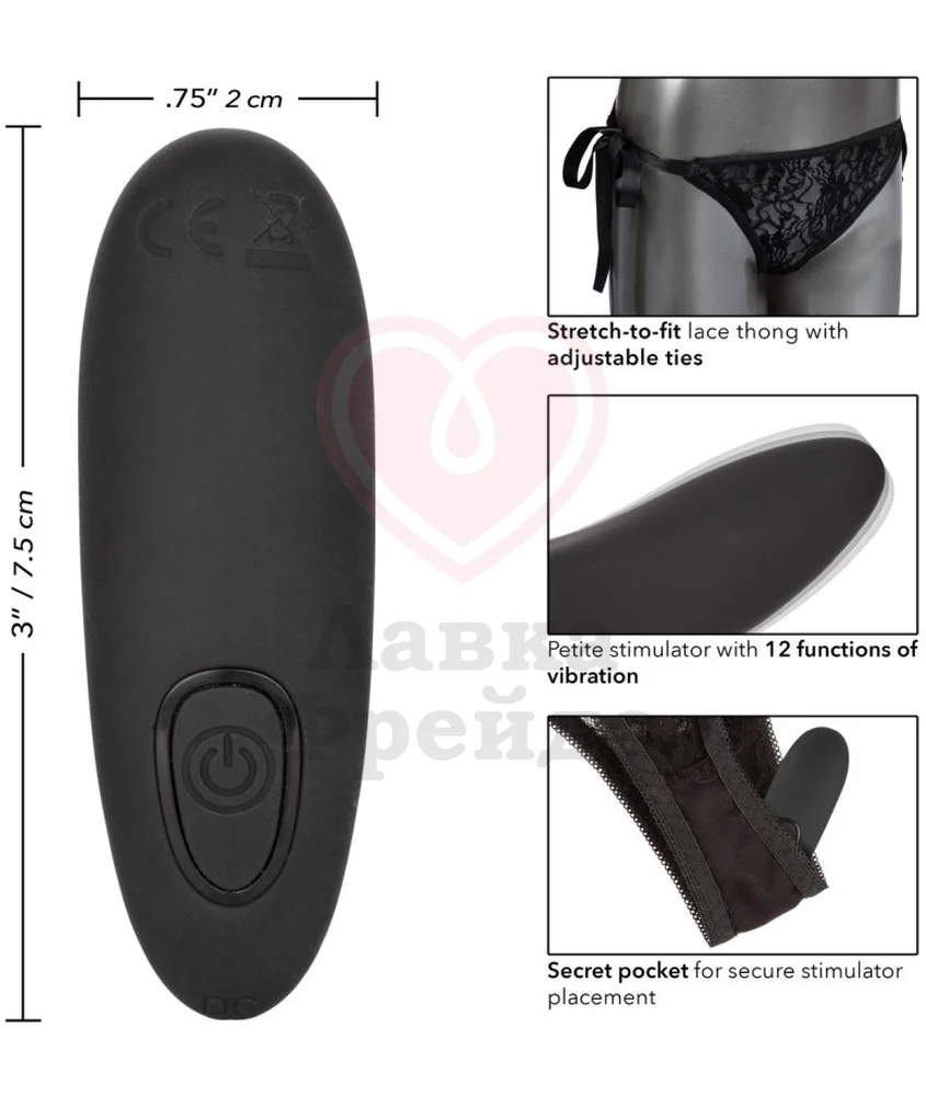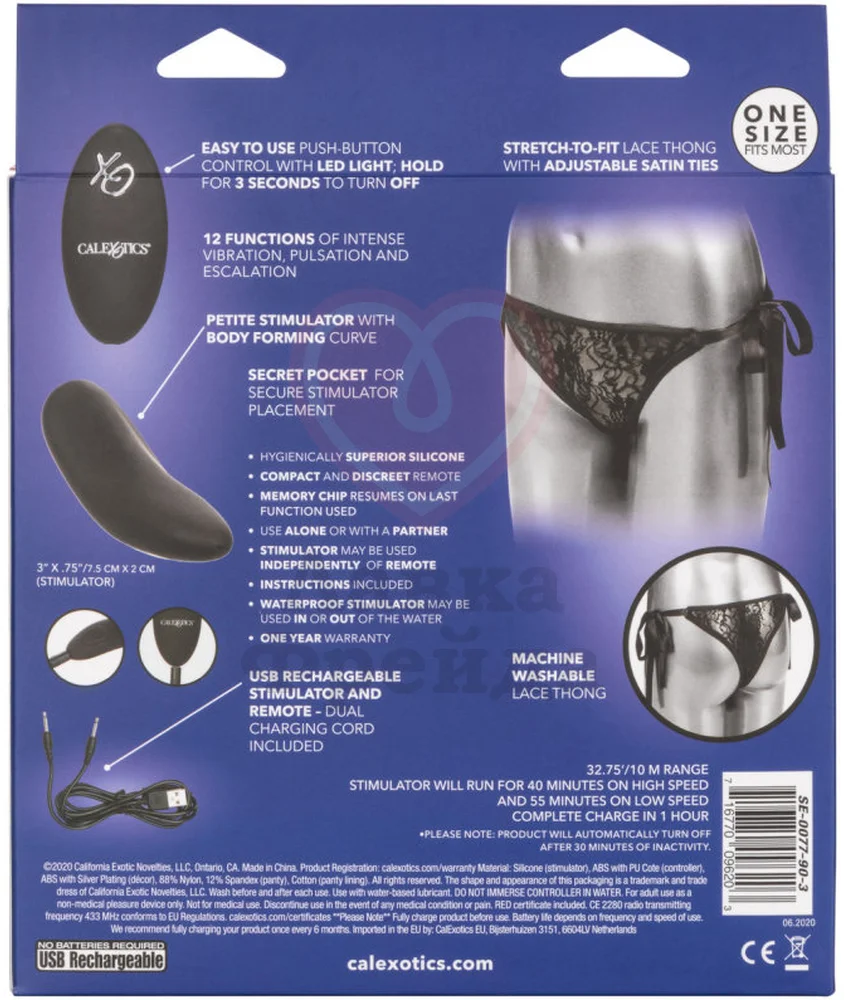 Control Lace Thong Set - это сексуальный комплект, состоящий из соблазнительных кружевных трусиков с атласными завязками по бокам и миниатюрного вибратора с 12 режимами работы, контролировать который можно как кнопкой на корпусе самой игрушки, так и пультом ДУ, с радиусом действия до 10 метров. Вибратор вставляется в специальный внутренний кармашек на белье. Трусики можно стирать в стиральной машине.