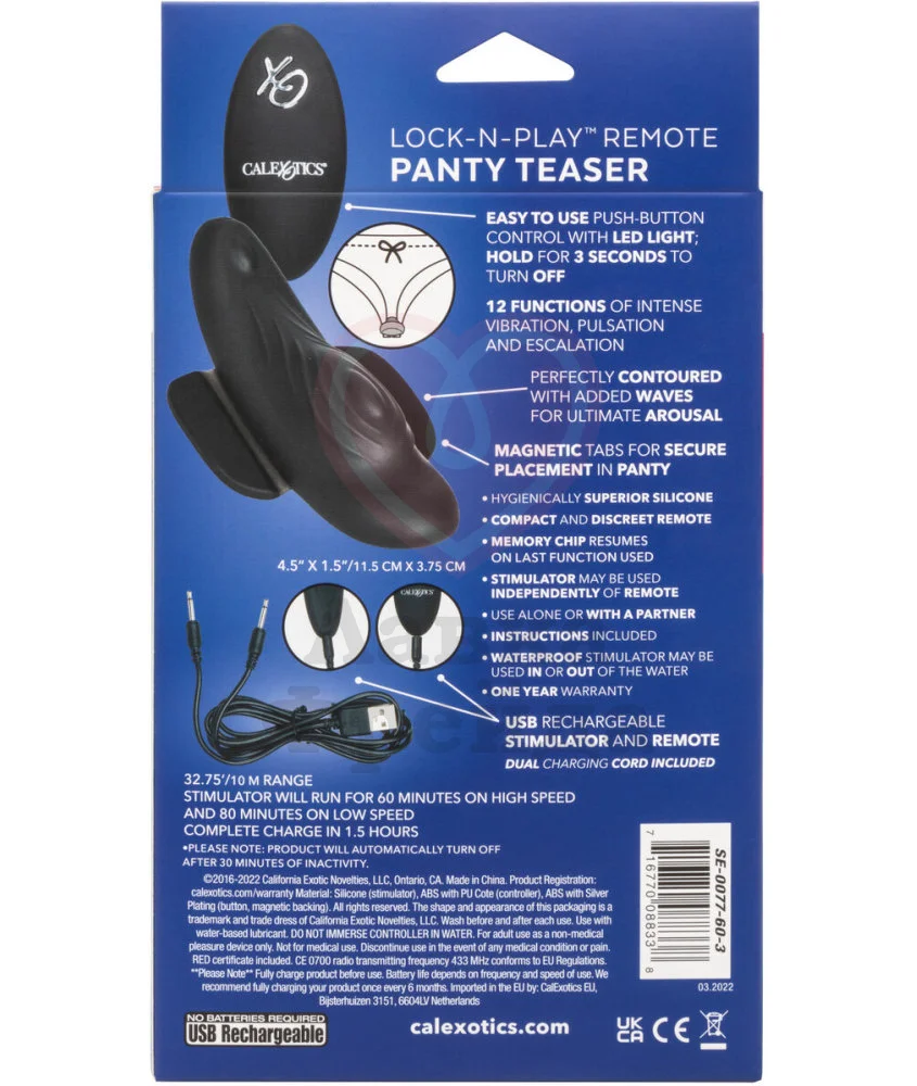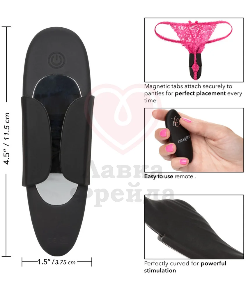 Трусики в комплект не входят, но их можно приобрести отдельно. Удобнее всего девайс крепится на трусиках-стрингах. Дополнительно можно приобрести браслет Wristband Remote Accessory, с помощью которого можно управлять любыми игрушками из серии CalExotics XO Collection.