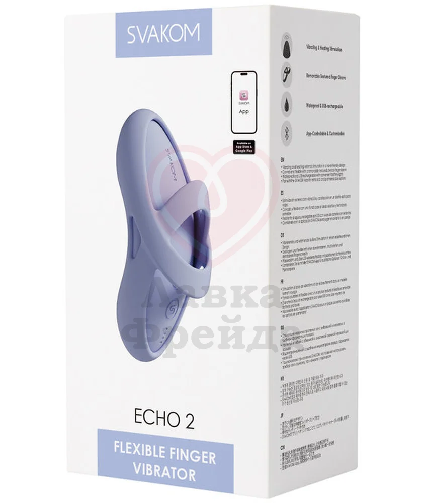 Вибратор Svakom Echo 2 надевается на пальцы для стимуляции внешних эрогенных зон - сосков, клитора, области половых губ и мужской промежности. С шелковистым силиконовым покрытием каждое прикосновение будет нежным и деликатным, а для более ярких эмоций можно использовать съемный чехол с рельефными элементами.
