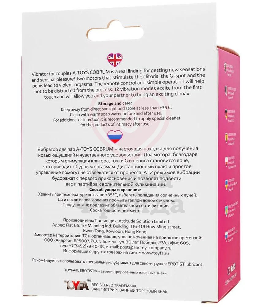 Вибратор A-Toys by Toyfa Cobrum обеспечивает одновременную стимуляцию внутренних эрогенных зон, включая зону G, клитора и члена партнёра. За счёт эргономичного дизайн аксессуар мягко соприкасается с телами обоих партнёров, а 12 режимов вибрации усиливают приятные ощущения от интимной близости.