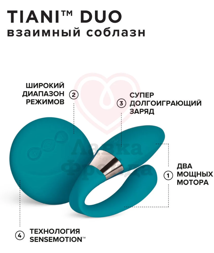 Lelo Tiani Duo – вибростимулятор для пар, который можно использовать прямо во время секса и получать еще большее удовольствие от дополнительной стимуляции точки G и клитора. Меньшим плоским концом вибратор вставляется вагинально для того, чтобы стимулировать точку G. Большая часть Tiani остается снаружи и ложится точно на клитор. Таким образом происходит одновременная стимуляция двух самых чувствительных эрогенных женских зон.