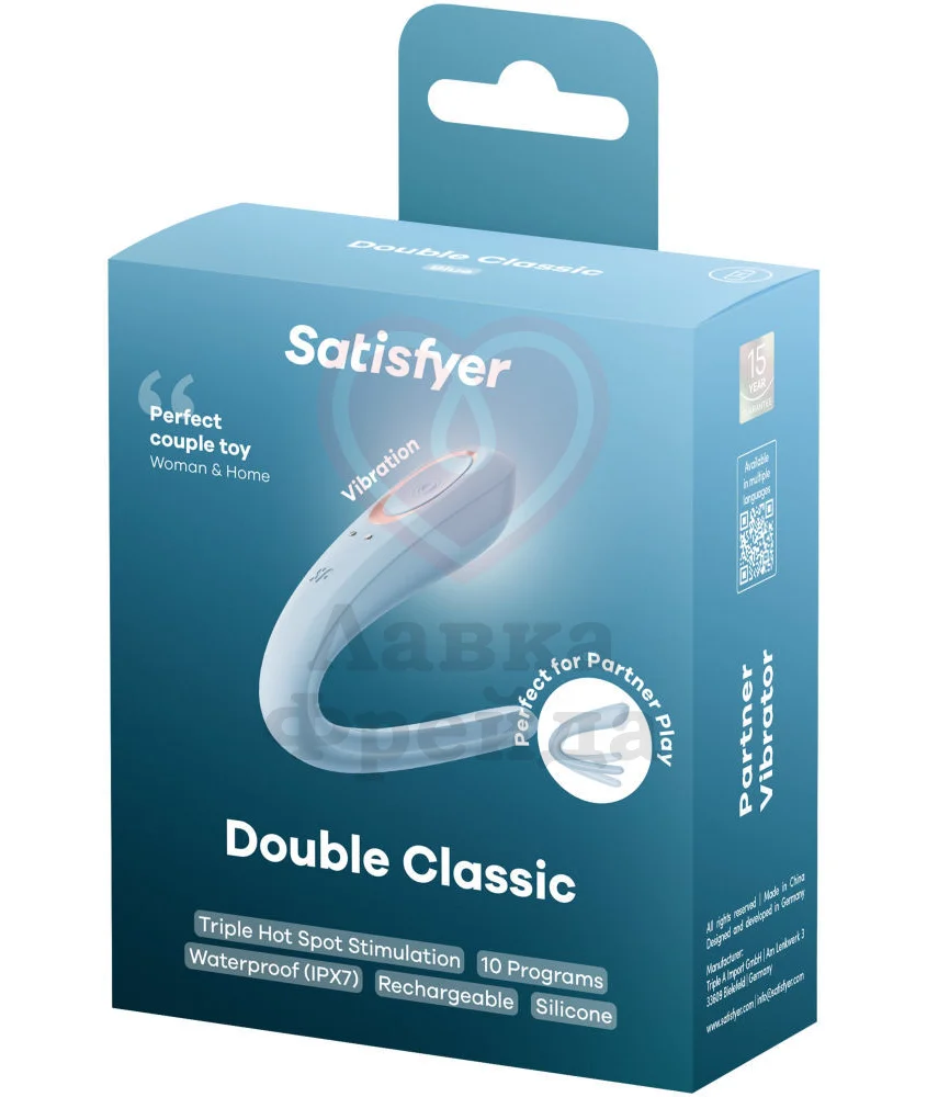 Satisfyer Double Classic - парный вибратор, который также можно использовать и для одиночной игры. Тонкий ствол вводится вагинально, точечно воздействуя на зону G, а внешняя часть, дополненная вибрационными элементами, стимулирует клитора и член партнёра, усиливая приятные ощущения от интимной близости.