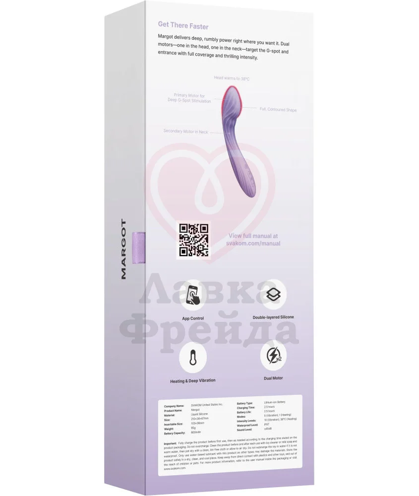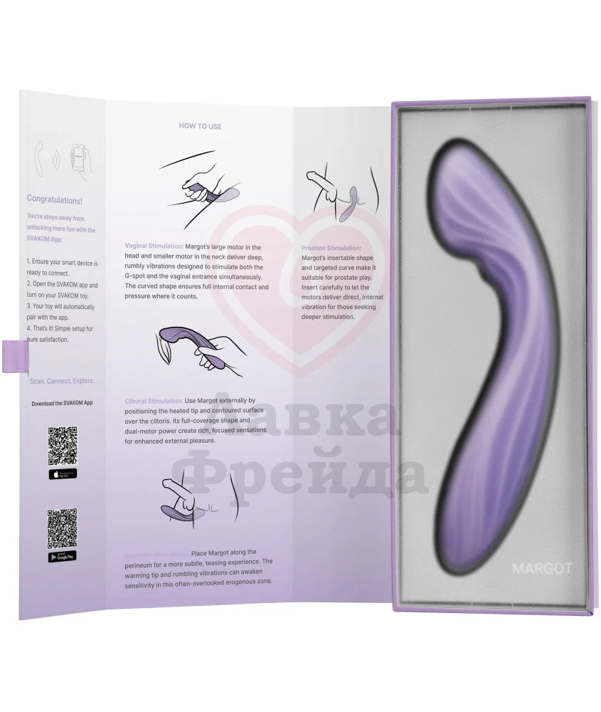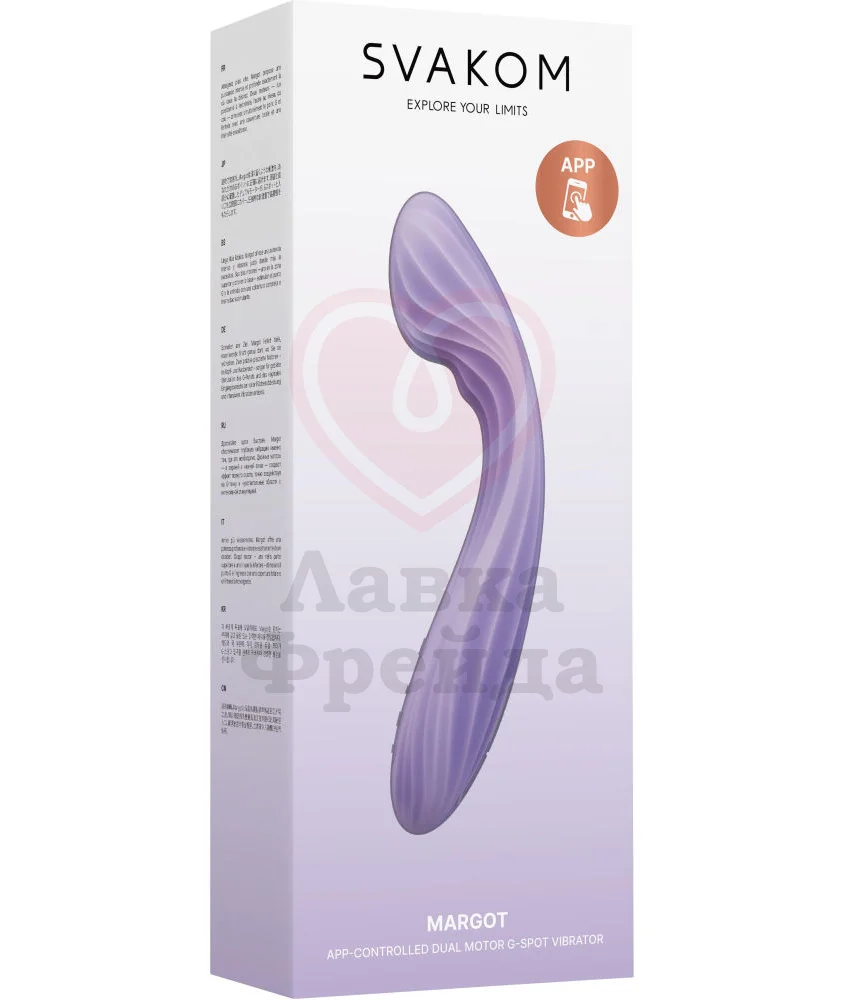 Интерактивный вибратор Svakom Margot имеет двухслойный силиконовый корпус и два мощных мотора, один из которых расположен в головке ― для стимуляции зоны G, а второй находится в гибком рукаве, предназначенном для стимуляции клитора.