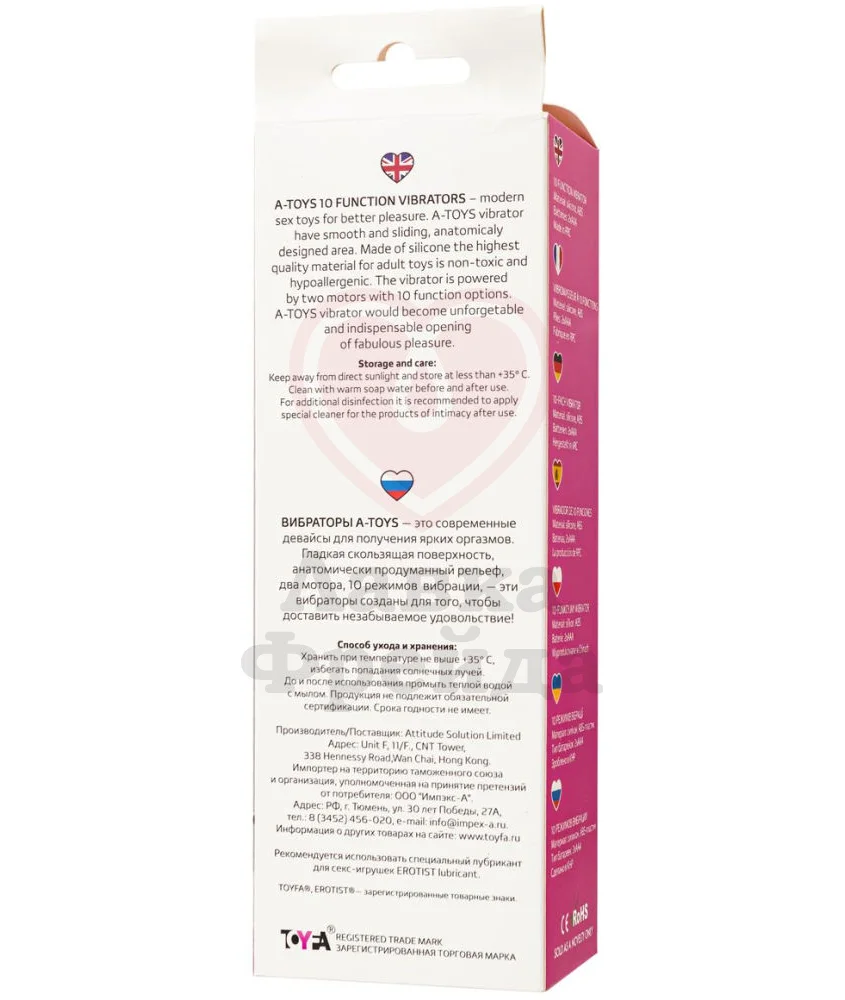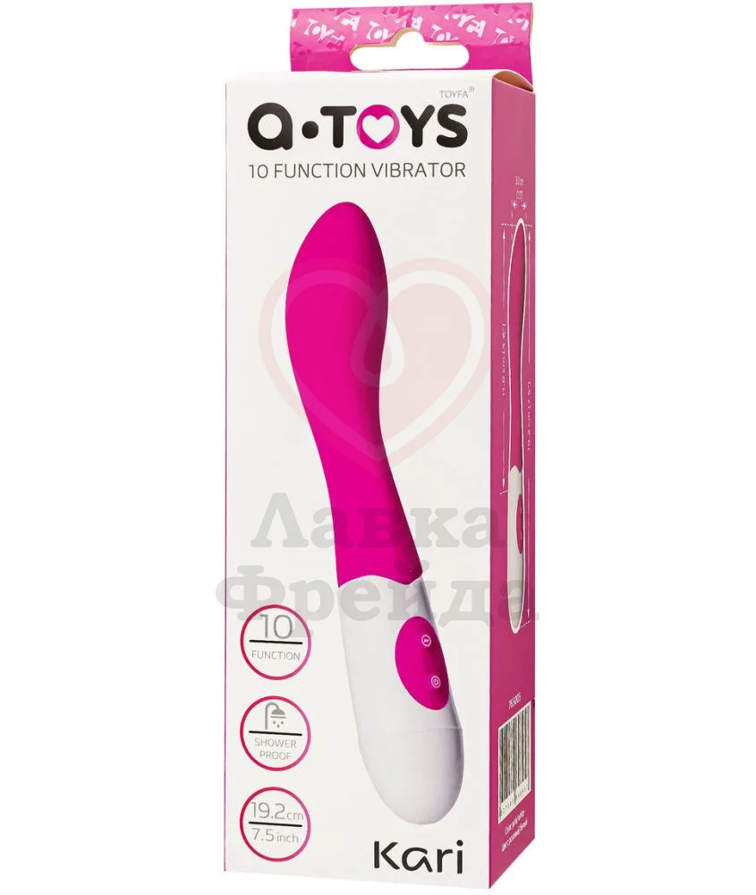 Вибратор A-Toys by Toyfa Kari имеет плавные изгибы и увеличенную головку с заострённым кончиком, чуть повёрнутую в сторону, предназначенную для точечной стимуляции зоны G, а 10 режимов вибрации позволят испытать яркую гамму ощущений. Движок изделия работает от 2 батареек типа AAA, а переключение между режимами происходит кнопками, расположенными в основании игрушки.