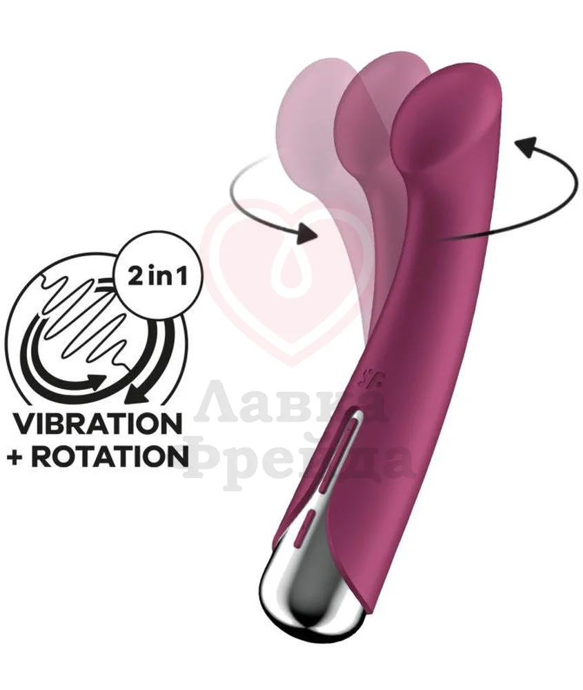 Вибратор Satisfyer Spinning G-Spot 1 имеет скошенный скругленный кончик и идеальный изгиб, за счет которых эффективно стимулируется передняя стенка вагины и чувствительная зона G. Удовольствие усиливают 12 уровней вибрации различной интенсивности и 5 режимов ротации, управляемых кнопками на корпусе: