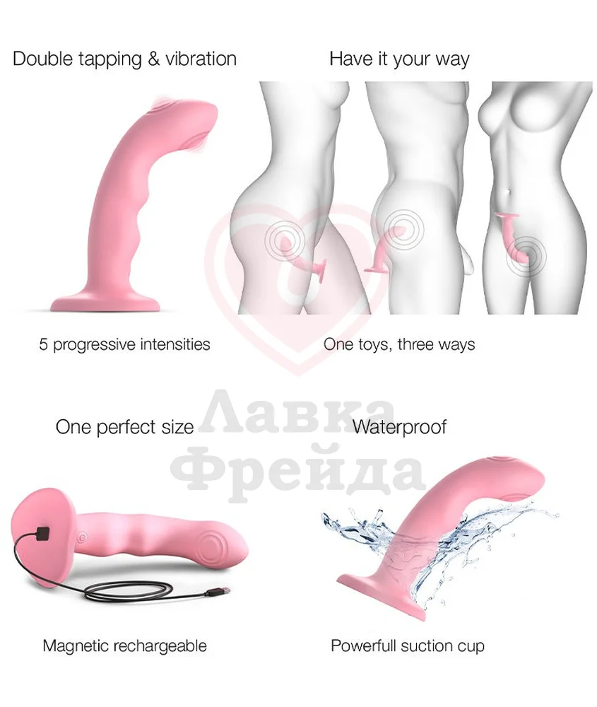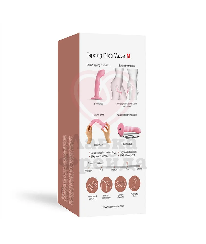 Изогнутый кончик Strap-On-Me Tapping Dildo Wave и его волнистая форма будут максимально эффективно воздействовать на самые чувствительные точки как женского, так и мужского тела, включая зону G и простату. Наслаждение от стимуляции дополнительно усилят 5 режимов вибрации и пульсации в области головки разной интенсивности.