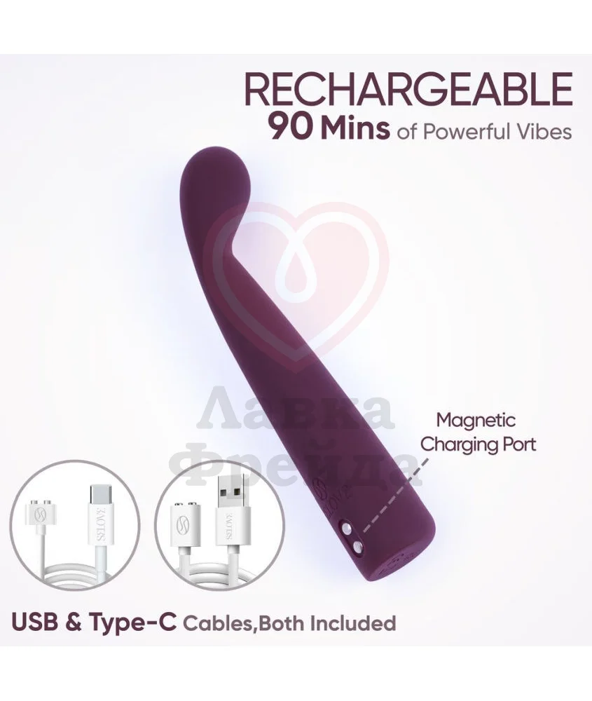 В комплект входят 2 магнитных кабеля зарядки с поддержкой USB и Type-C - при полной зарядке вы получите до 1 часа непрерывной вибрации на самых высоких скоростях. Для большего комфорта возьмите лубрикант на водной основе. Для очистки используйте тёплый мыльный раствор, либо воспользуйтесь специальным антибактериальным спреем для игрушек.