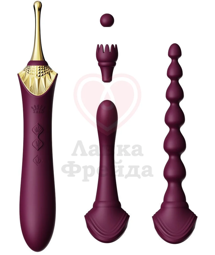 Набор включает в себя четыре сменные насадки: шарик, лепесток, G-spot насадка и анальная ёлочка, что даёт возможность экспериментировать с разными типами стимуляции - от нежных прикосновений до глубокого проникновения. А также мешочек для хранения, сшитый из нежного шёлка.