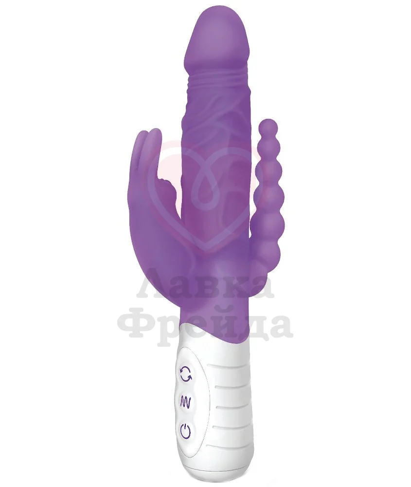 Фиолетовый вибратор-кролик от Rabbit Essentials создан для тройной стимуляции: клиторальной, вагинальной и анальной одновременно. Вагинальная часть обладает реалистичной формой — анатомическая головка дополнена рельефной поверхностью с венками. Внутри неё также находятся вращающиеся шарики для дополнительной стимуляции.