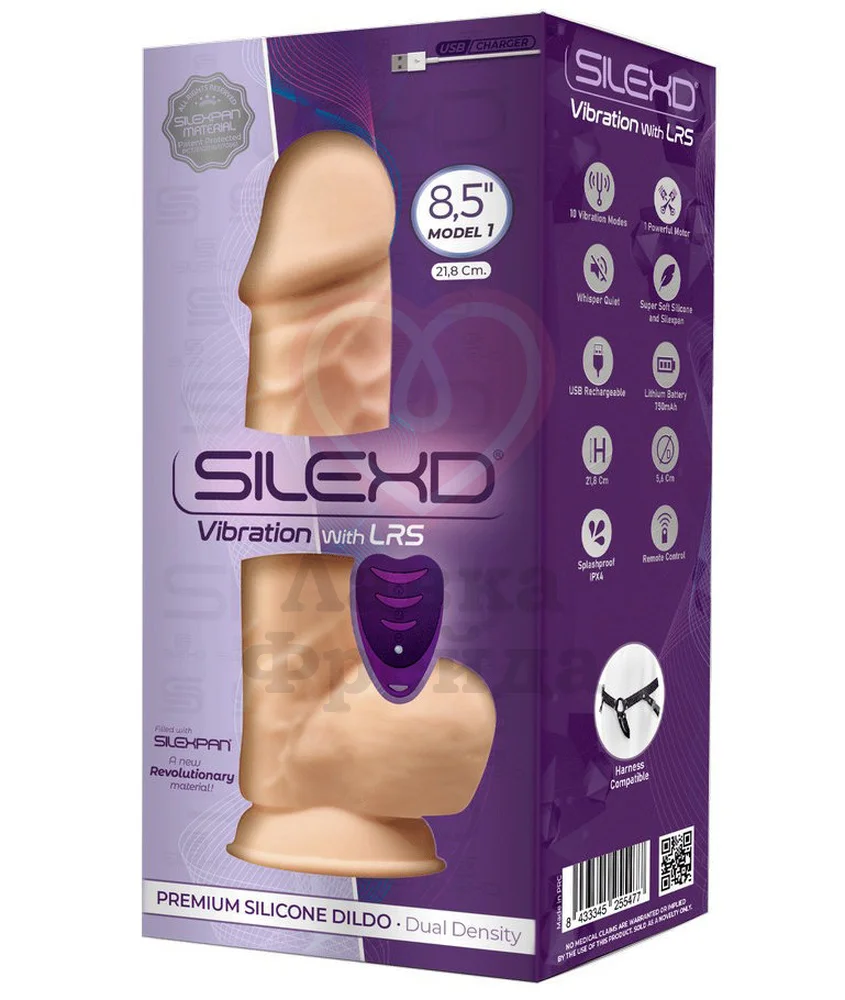 Реалистичный вибратор SileXD Model 1 выполнен из фирменного материала Silexpan — особенного вида силикона, который такой же нежный на ощупь, но легче и пластичнее. У девайса 10 режимов вибрации, которыми можно управлять при помощи безпроводного пульта. Игрушка имеет анатомическую форму: упругий ствол с венками, мошонку и выраженную головку. Общая длина составляет 21 см, длина проникновения — 16 см, а максимальный диаметр — 5 см.