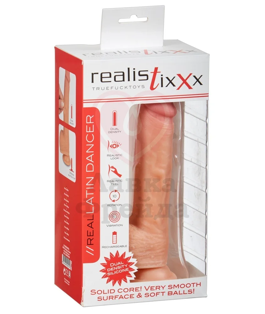 Вибратор Latin Dancer выполнен в реалистичном виде: телесный цвет, нежный материал, напоминающий кожу, упругий ствол, рельефные венки, ярко выраженная головка и объёмная мошонка. У него два вида воздействия — вибрация и ротация в 10 разных видах, стимуляция получается ещё более объёмная игрушка не только передаёт ритм мотора, но ещё и совершает круговые движения.