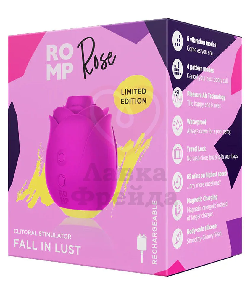 Romp Suction Rose — уникальный вакуумный клиторальный стимулятор в форме компактной яркой розы. Бренд Romp применяет фирменную для Womanizer технологию Pleasure Air Technology — бесконтактного воздействия при помощи воздушных волн. Настоящее наслаждение, которое может уместиться в вашей ладони!