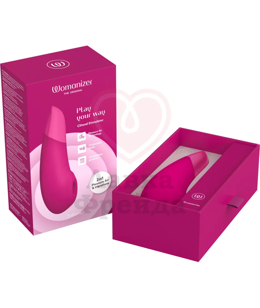 Womanizer Enhance сочетает в себе вакуумную стимуляцию и вибрацию для усиления ощущений. Больше разнообразия - ярче впечатления! 2 мощных моторчика обеспечивают раздельное управление функциями: