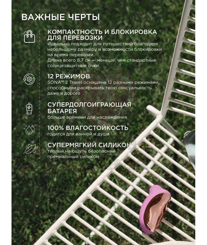 Lelo Sona 2 Travel – это компактная версия Lelo Sona 2, которая идеально подходит для путешествий благодаря небольшому размеру и возможности блокировки на время перевозки. Он доставит вам удовольствие без непосредственного контакта — за всю работу отвечают звуковые волны, которые мягко стимулируют клитор с помощью особой технологии SenSonic.