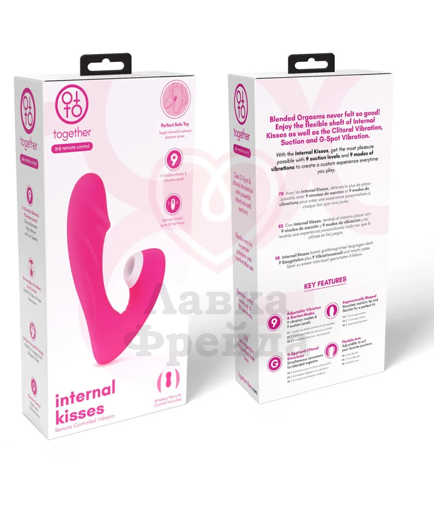 Internal Kisses Together доведет вас до оргазма с помощью тройного воздействия - стимуляция внутренних эрогенных зон, зоны G и клитора. Гибкий вагинальный отросток дополнен специальным выступом, который отвечает за точечное воздействие на зону G. А наслаждение от проникновения дополнительно усилят 9 вибро-режимов разной интенсивности. Маленький отросток нежно стимулирует клитор 9 режимами всасывания, которые достаточно точно имитируют ощущения от оральных ласк.