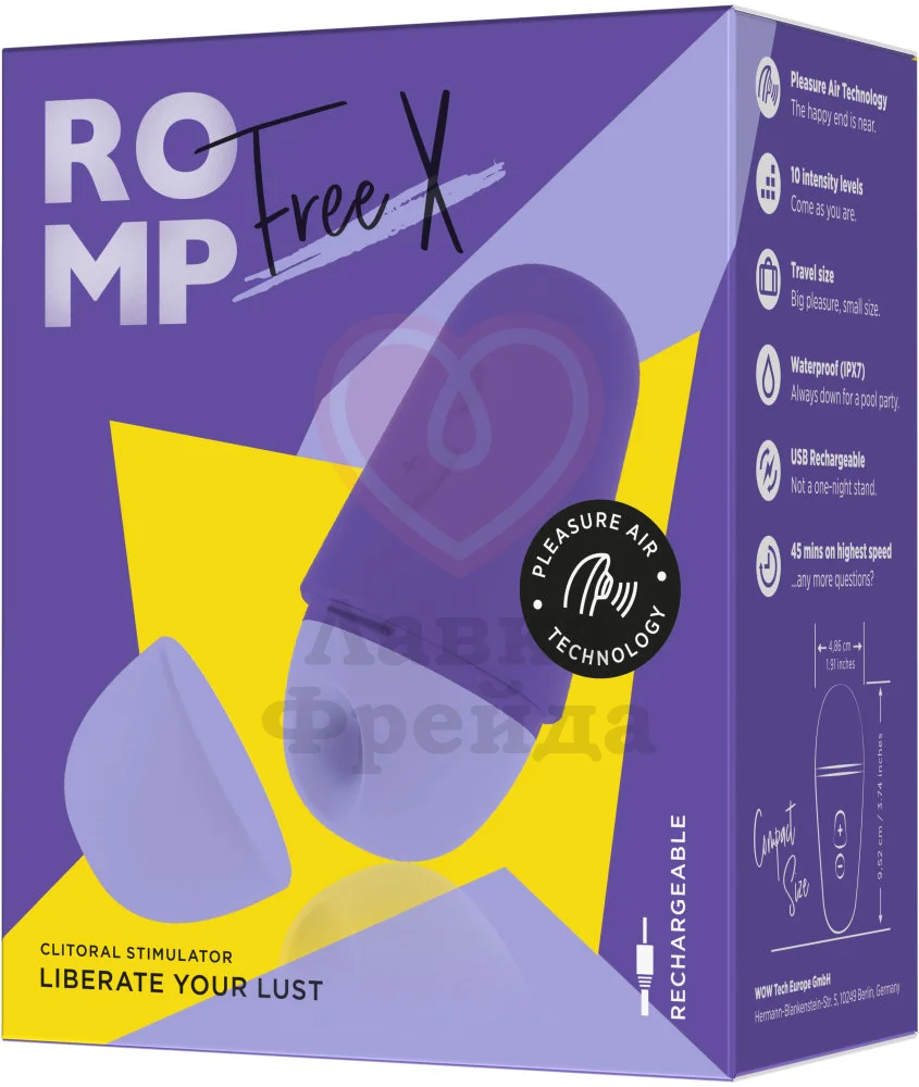 Вакуумный стимулятор Romp Free X имеет внутри мембрану, которая производит мягкие импульсы воздуха ласкающие клитор, больше имитируя оральный секс, а не вакуумное всасывание. Эта современная технология Pleasure Air обеспечит яркие ощущения от мастурбации, не соприкасаясь с клитором напрямую.