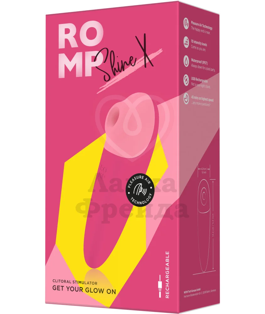Вакуумный стимулятор Romp Shine X оснащен современной технологией Pleasure Air, которая обеспечит яркие эмоции от мастурбации, не соприкасаясь с клитором напрямую. Внутри девайса находится мембрана, которая производит мягкие импульсы воздуха, вызывая ощущения больше похожие на оральный секс, а не вакуумное всасывание.