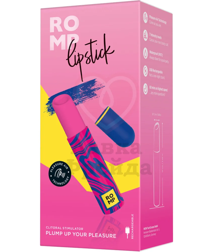 Romp Lipstick — это вакуумный стимулятор клитора в необычном корпусе в виде небольшой помады. Благодаря технологии Pleasure Air с бесконтактными волнами давления воздуха стимуляция одновременно нежная и интенсивная. 7 уровней переключаются нажатием кнопки на корпусе.