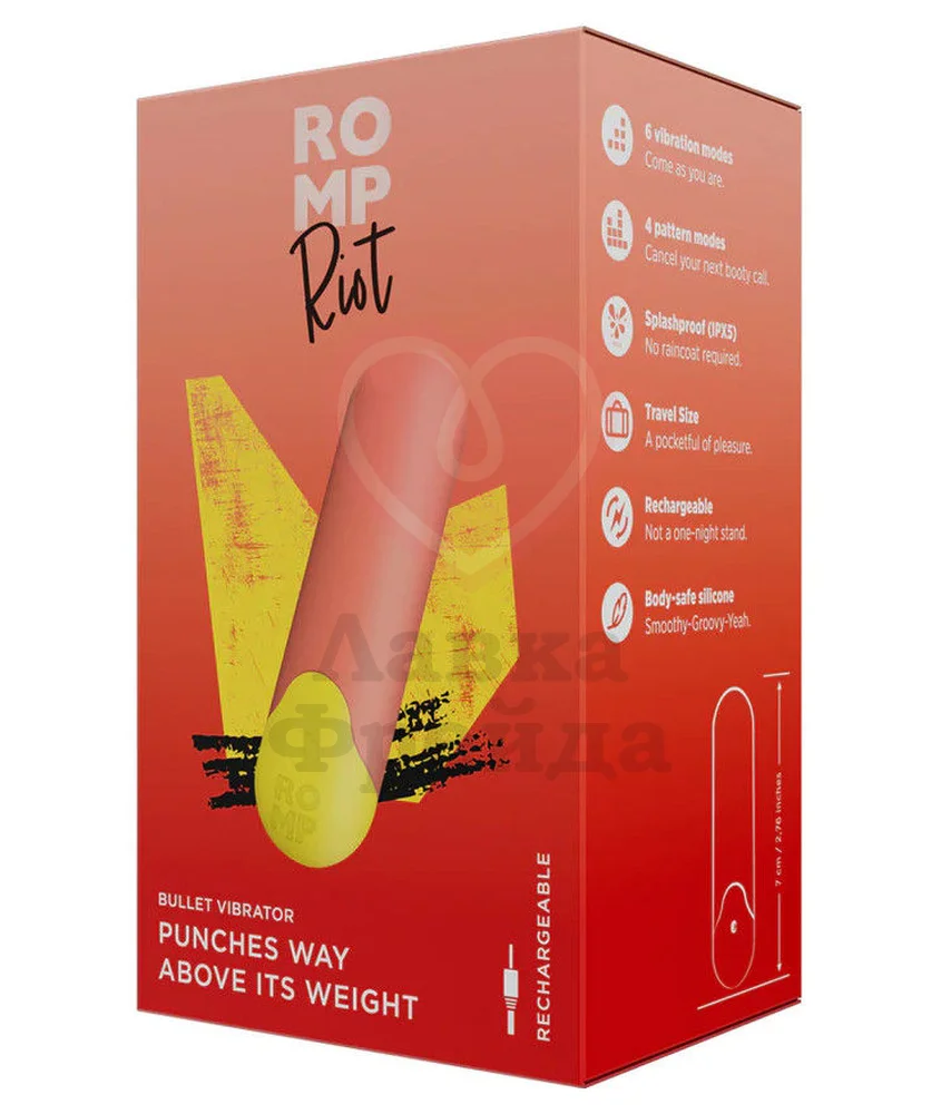 Касайтесь всех чувственных точек на вашем теле или теле партнера — и получайте максимум приятных впечатлений! Мощная вибропуля не занимает много места и сможет составить вам компанию в любом путешествии или приключении. При желании совмещайте вибропулю с лубрикантом на водной основе — так кончик будет скользить ещё плавнее и приятнее. Romp Riot также имеет защиту от брызг IPX5, поэтому лучше всего очищать её со специальными средствами для игрушек — это быстро и удобно.