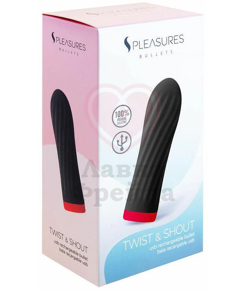 Вибропуля Pleasures TwistShout покрыта фактурными закрученными ложбинками, которые своей фактурой будут дополнительно воздействовать на внешние эрогенные зоны: клитор, соски, мошонку. Мотор, перезаряжаемый через магнитный USB кабель, предлагает 10 паттернов вибрации, переключаемых всего одной кнопкой в основании девайса.