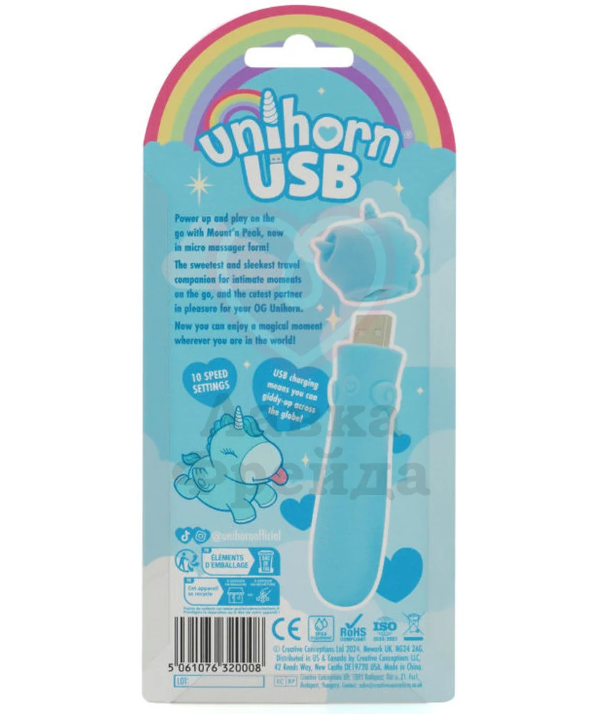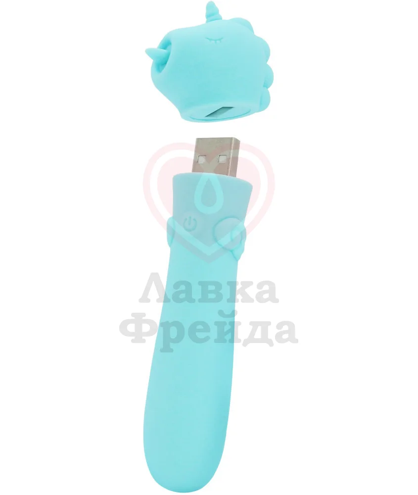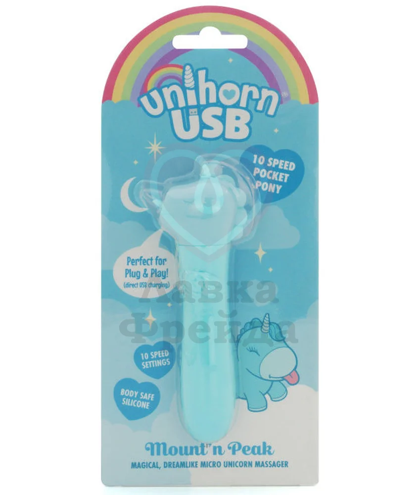 Unihorn Usb Mount'n Peak - вибропуля в виде голубого единорога, которая легко спрячется в любой женской сумочке или даже косметичке. Мощный моторчик отвечает за работу 10 комбинированных режимов вибрации и движений язычка. Полная зарядка, на протяжении 2-х часов, обеспечит до 1 часа беспрерывной работы аксессуара. Для зарядки снимите колпачок и вставьте USB накопитель в разъем компьютера или ноутбука.