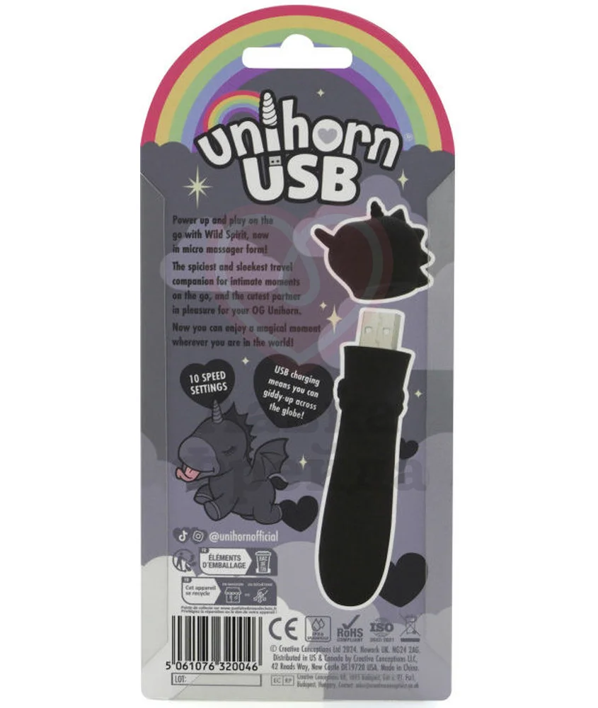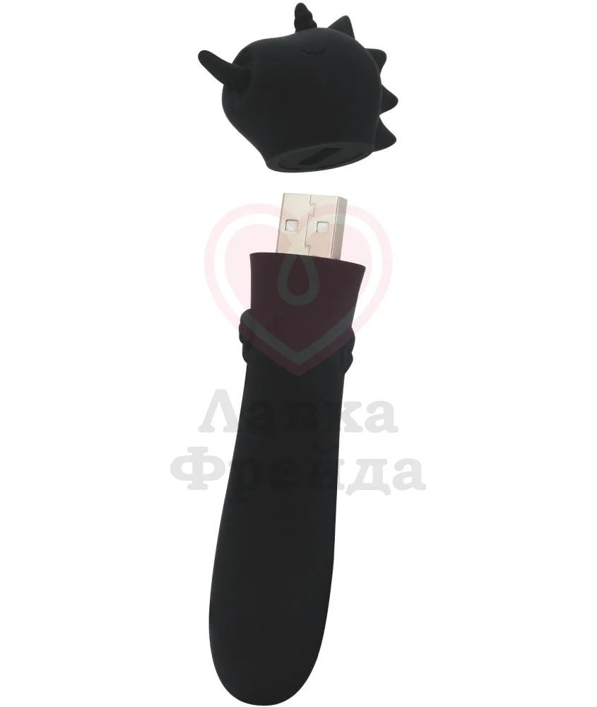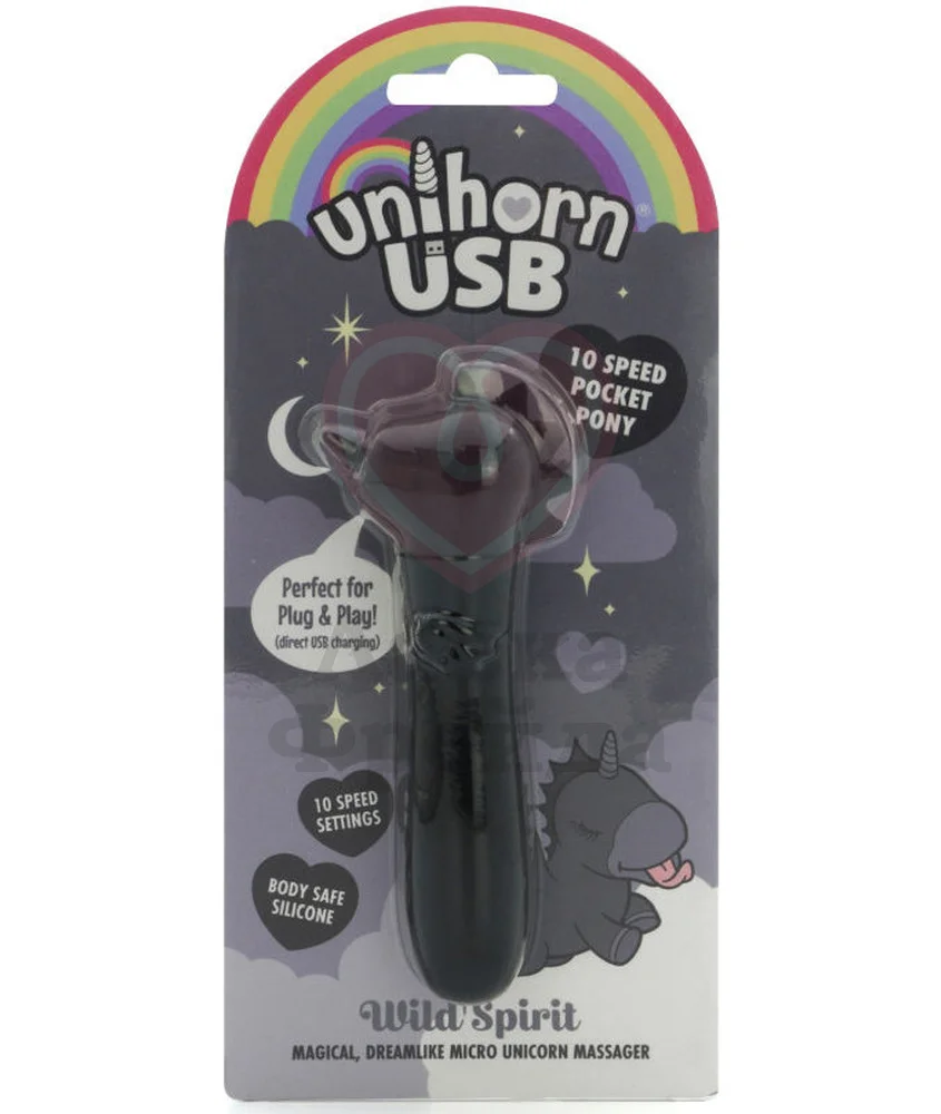 Unihorn Usb Wild Spirit - вибропуля в виде единорога, которая будет нежно стимулировать клитор 10 комбинируемыми режимами вибрации и движений язычком. Игрушка выполнена из медицинского силикона, представленного в глубоком чёрном цвете - материал, совместимый со смазками только на водной основе.