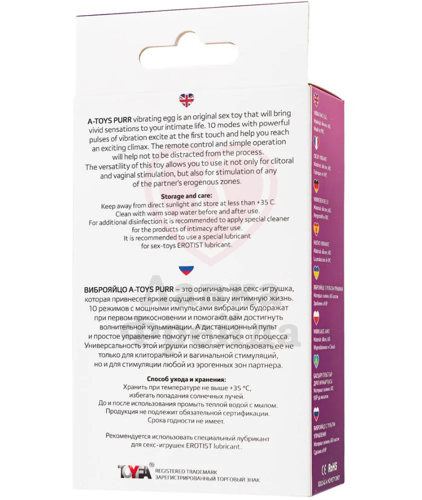 Виброяйцо A‐Toys by Toyfa Purr - компактная игрушка для тех, кто ценит интенсивную стимуляцию как внешних, так и внутренних эрогенных зон. Удлинённая форма и 10 режимов вибрации позволяют проработать самые чувствительные точки, а компактный пульт управления даёт возможность переключаться между режимами без лишних усилий.
