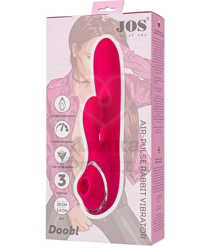Одна сторона многофункциональной игрушки Jos Doobl - классический вибратор-кролик, который обеспечивает одновременную клиторальную и вагинальную стимуляцию 10 вибро-режимами и воздействием на зону G. Другая - вакуумно-волновой стимулятор с 3 режимами работы, который нежно ласкает клитор бесконтактными воздушными толчками.