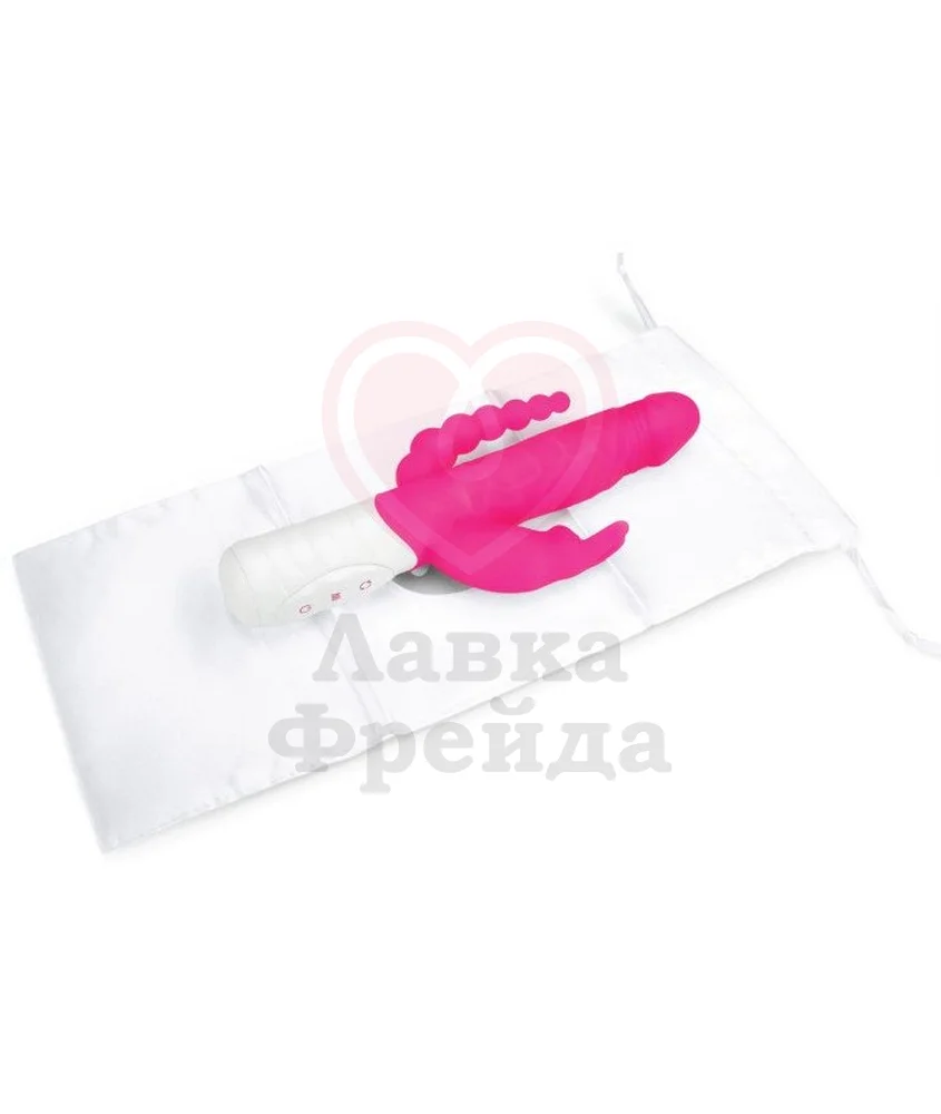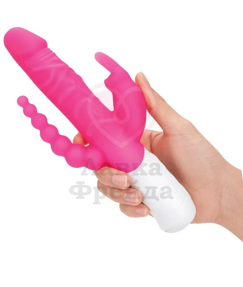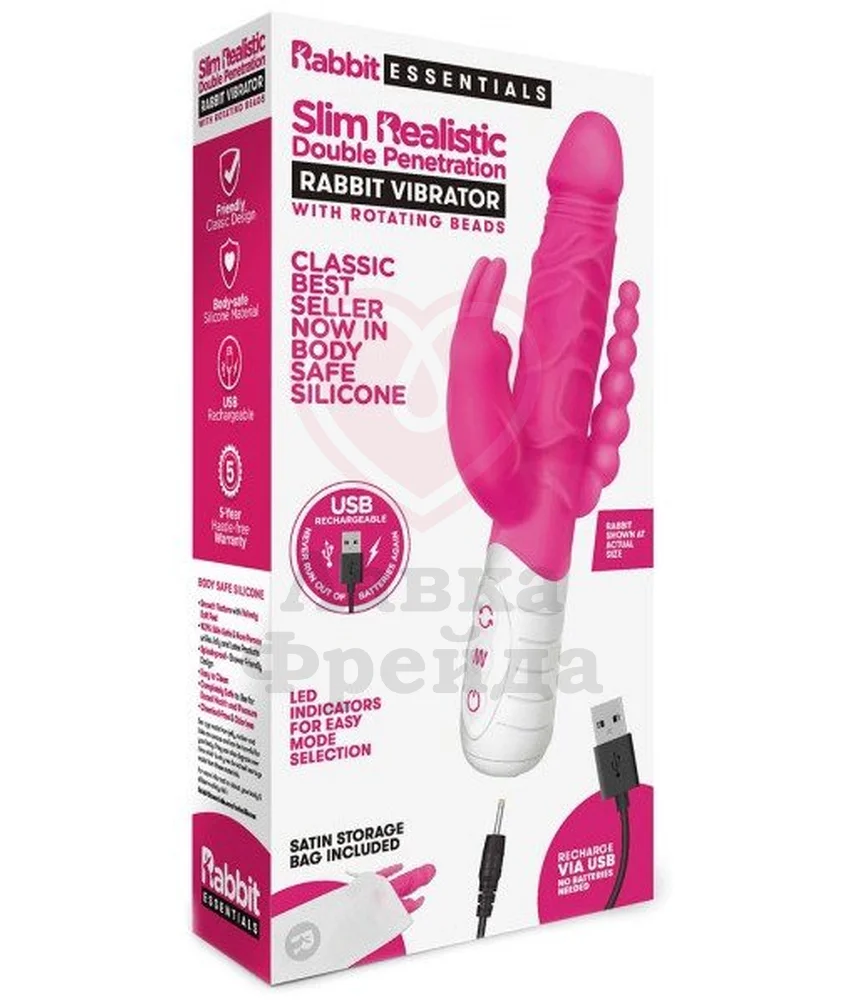 Розовый вибратор-кролик от Rabbit Essentials создан для тройной стимуляции: клиторальной, вагинальной и анальной одновременно. Вагинальная часть обладает реалистичной формой — анатомическая головка дополнена рельефной поверхностью с венками. Внутри неё также находятся вращающиеся шарики для дополнительной стимуляции.