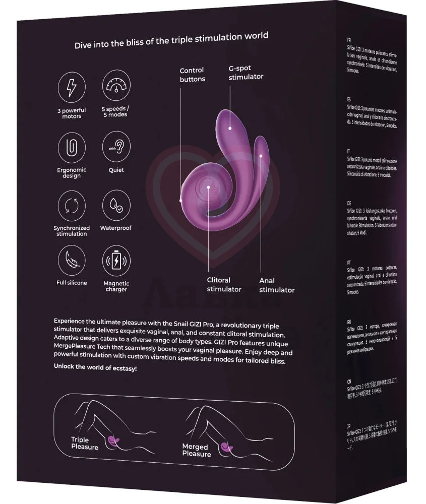 Вибратор-кролик SVibe Gizi Pro имеет уникальный раскручивающийся дизайн, который быстро подстраивается под индивидуальные изгибы тела, точечно стимулируя самые чувствительные эрогенные зоны. Ярко-фиолетовый девайс обеспечивает синхронную стимуляцию клитора, ануса и вагины 5 режимами вибрации с 5 вариантами интенсивности.