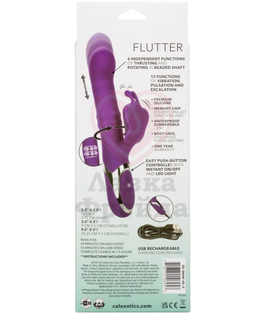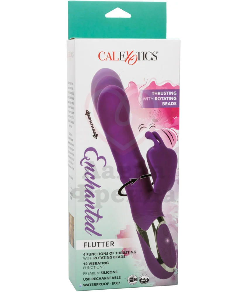 Вибратор-кролик Enchanted Flutter имеет клиторальный отросток в виде бабочки с усиками, который дополнительно стимулирует клитор, усиливая наслаждения от мастурбации. Основной ствол воздействует на самые чувствительные зоны женского тела 12 вибро-режимами, которые усиливают 4 уровня возвратно-поступательных движений разной интенсивности и стимуляция бусинками, расположенными по всей длине ствола.