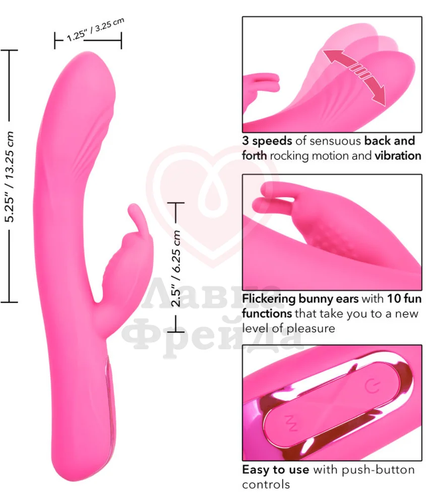Увеличенная головка вибратора-кролика Elite Rocking Rabbit имеет 3 скорости массажа зоны G, обеспечивая максимум удовольствия от стимуляции внутренних эрогенных основным стволом длиной 13 см. Маленький отросток длиной 6 см с двумя движущимися ушками, нежно ласкает клитор 10 режимами интенсивной вибрации. Скорости массажа и уровни вибрации переключаются кнопками на панели управления, расположенной на корпусе игрушки. Оба отростка могут работать независимо друг от друга.