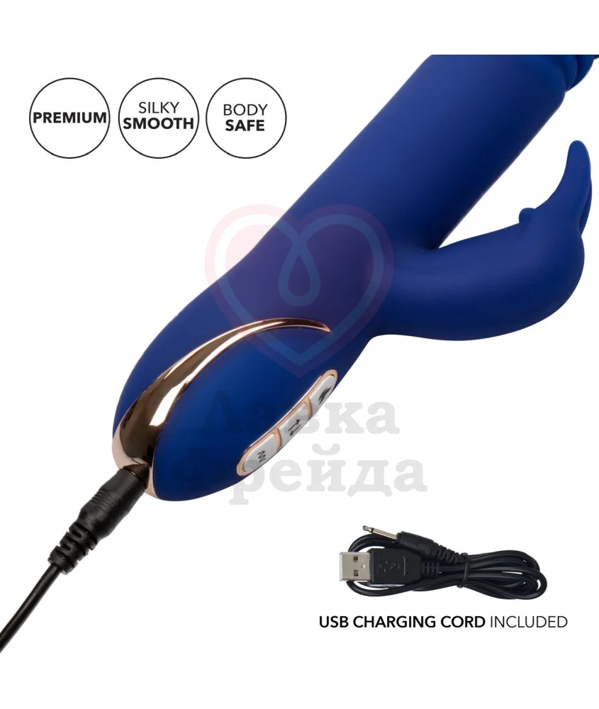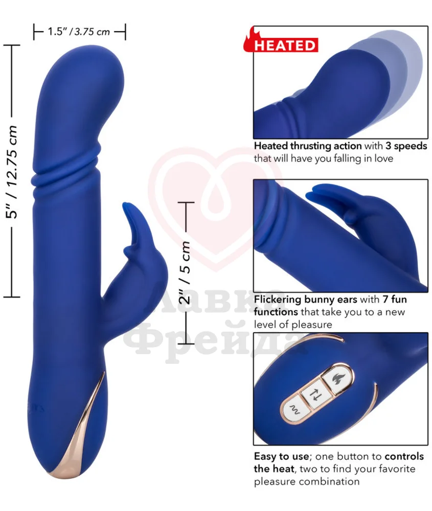 Вибратор-кролик Signature Heated Thrusting G Rabbit имеет два мощных мотора, которые обеспечивают 7 режимов вибрации и 3 скорости пульсации, а также возможность нагреваться до 45 градусов по Цельсию. Управляется с помощью 3-х кнопочной панели с LED-подсветкой, расположенной на основании игрушки. Основной ствол длиной 13 см совершает интенсивные поступательные движений, стимулируя внутренние эрогенные зоны, а отросток длиной 5 см с двумя подвижными ушками ласкает клитор.