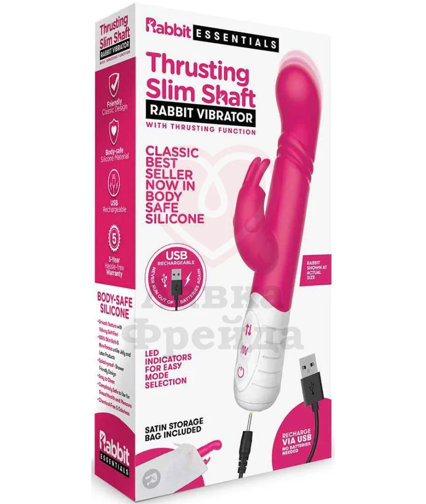Вибратор-кролик Slim Shaft Thrusting G-Spot Rabbit имеет толчковую, пульсирующую головку с изгибом, которая точечно стимулирует чувствительную зону G. Небольшой отросток, дополненный ушками, дополнительно ласкает клитор, увеличивая шансы на получение яркого оргазма. Управление происходит кнопками, расположенными на корпусе вибратора. Можно аккуратно мыть водой с добавлением мягкого мыла или обрабатывать специальным спреем для игрушек. Комбинировать с лубрикантами на водной основе.