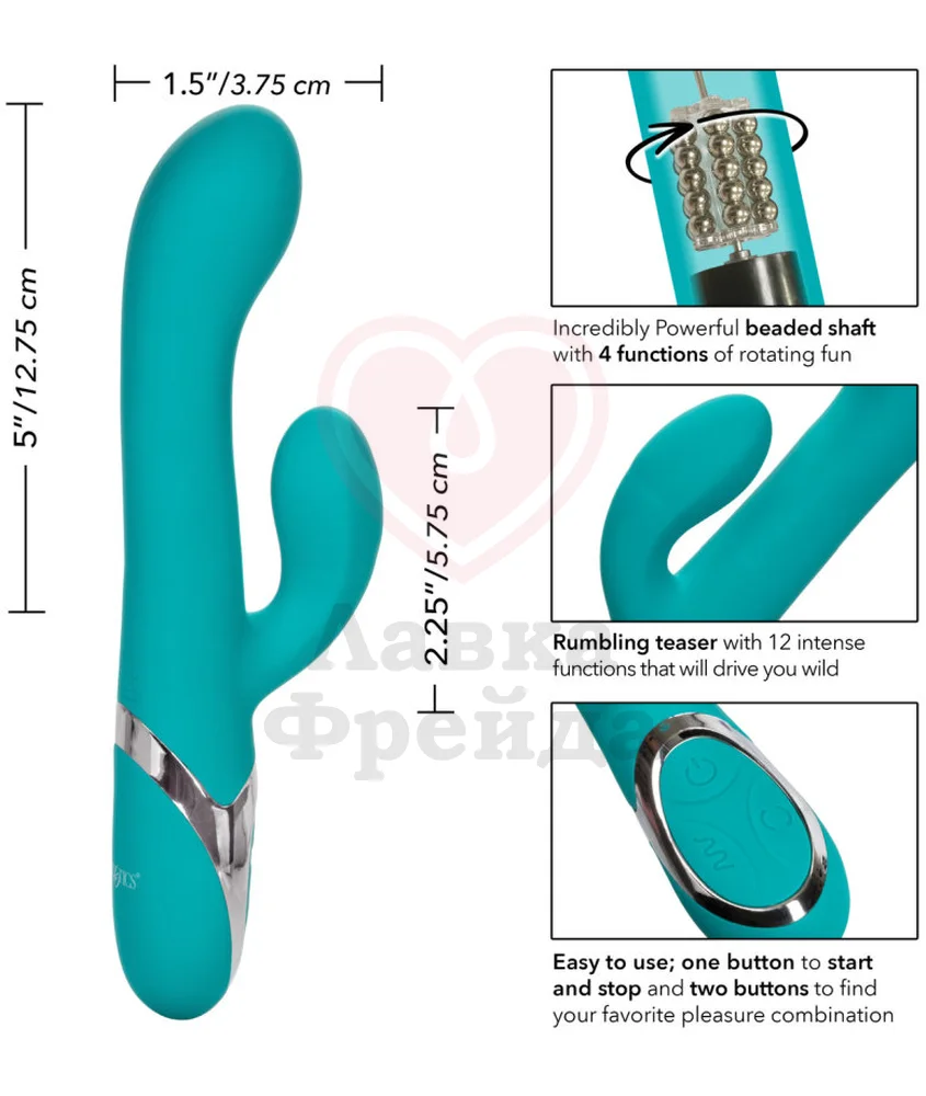 Вибратор-кролик Enchanted Lover - это 12 уровней вибрации и 4 режима ротации четырьмя рядами вращающихся шариков, работающих от двух мощных моторов. Основной ствол игрушки, длиной 13 см, эффективно стимулирует внутренние эрогенные зоны, а гибкий изогнутый кончик массирует зону G, даря яркие ощущения. Маленький отросток длиной 7,5 см в виде лепестка, повторяет телесные изгибы, чувственно лаская нежную область клитора.