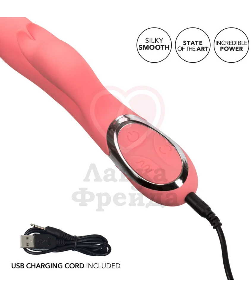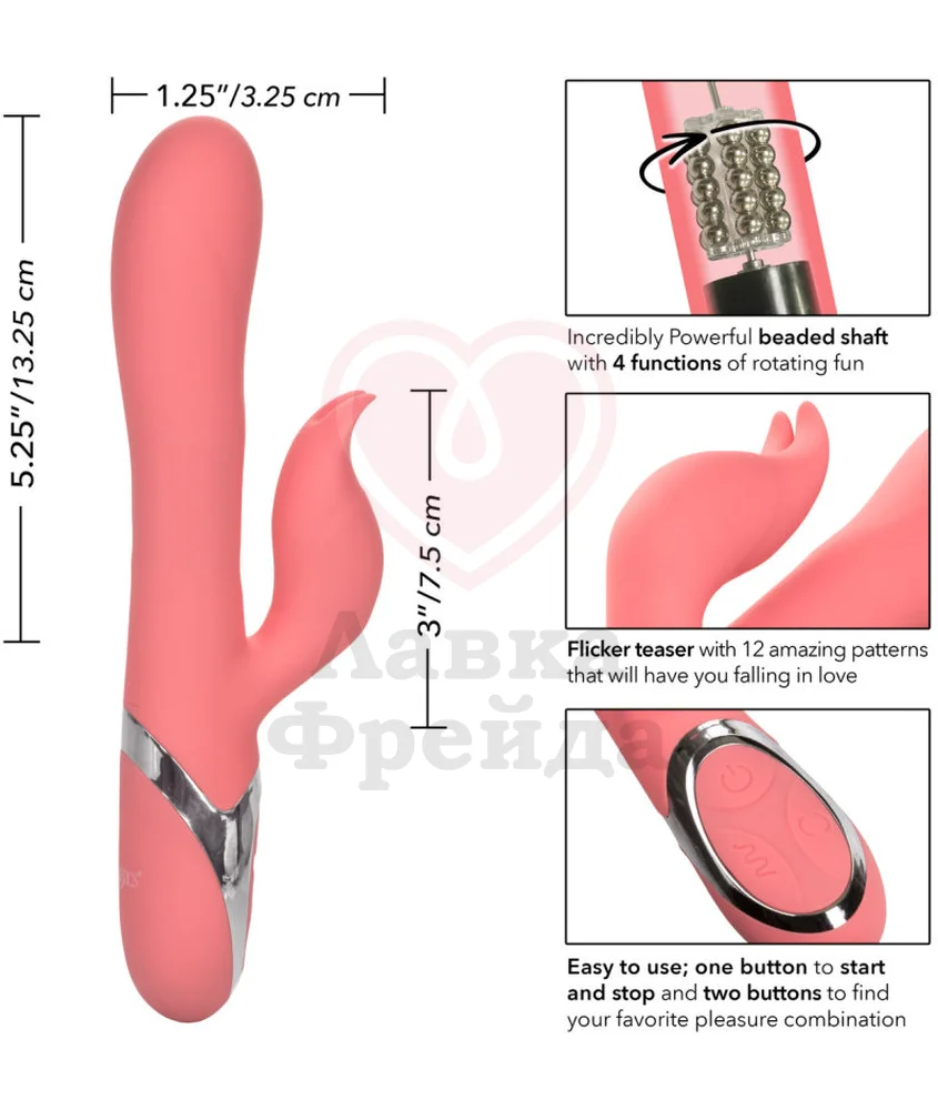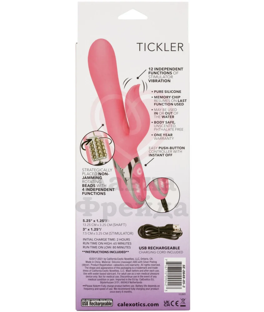 Вибратор-кролик Enchanted Tickler - это 12 уровней вибрации и 4 режима ротации четырьмя рядами вращающихся шариков, работающих от двух мощных моторов. Основной ствол игрушки, длиной 13 см, эффективно стимулирует внутренние эрогенные зоны, а гибкий изогнутый кончик массирует зону G, даря яркие ощущения. Маленький отросток длиной 7,5 см в виде лепестка, повторяет телесные изгибы, чувственно лаская нежную область клитора.