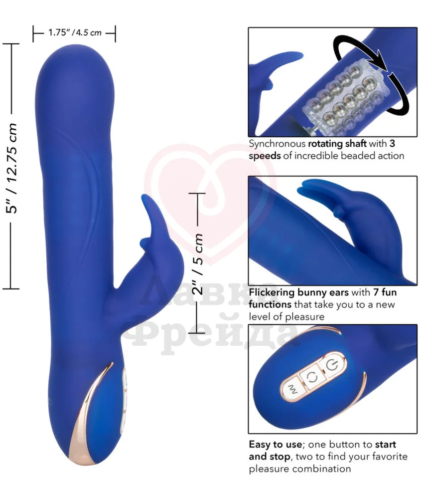 Вибратор-кролик Signature Rotating Beaded Rabbit имеет фактурную ребристую головку, а также 7 режимов вибрации и 3 уровня ротации в большом отростке. Управляется с помощью 3-х кнопок с LED-подсветкой, расположенных на основании девайса. Основной ствол, длиной 13 см, качественно стимулирует внутренние эрогенные зоны, а отросток длиной 5 см с двумя движущимися ушками нежно ласкает клитор.