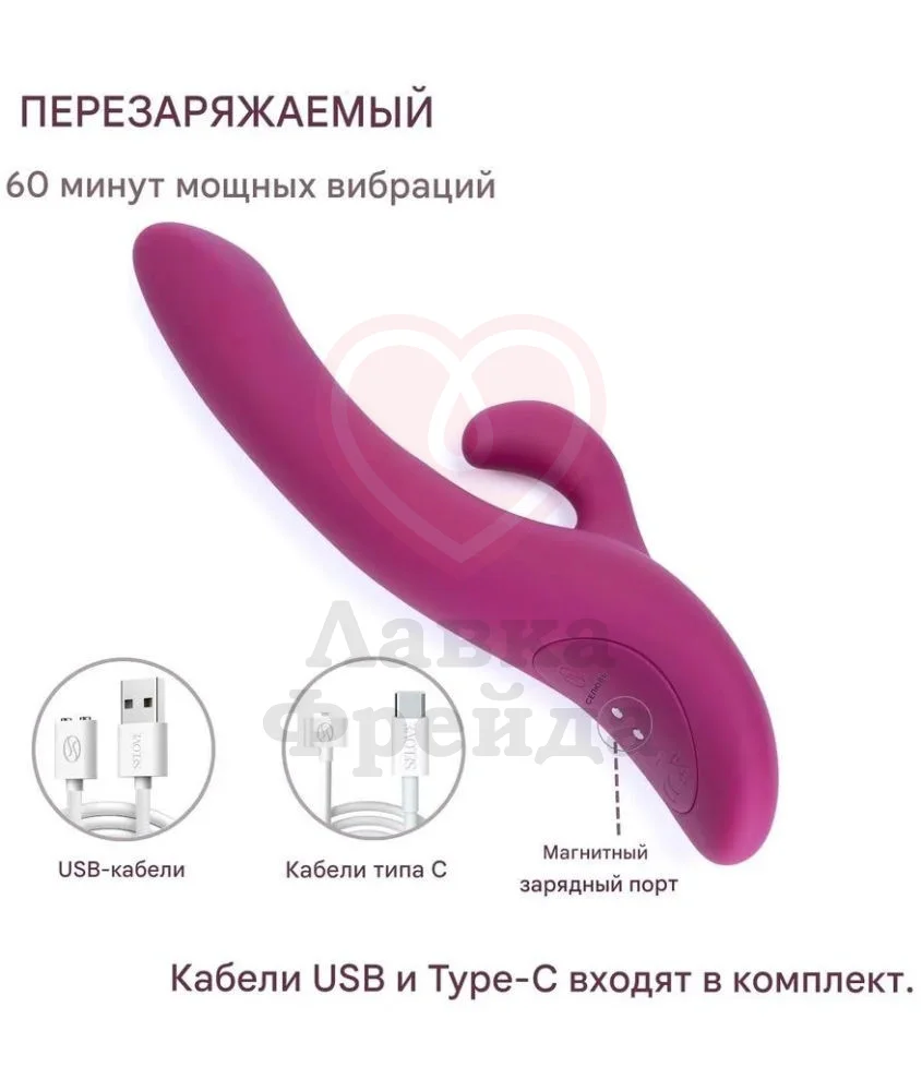 Имеет высокий уровень защиты от влаги - IPX7, поэтому его можно брать с собой в душ или ванну, однако недопустимо держать устройство в воде дольше 30 минут или опускать на глубину более 1 метра. Полностью заряженные моторы (2 часа) обеспечат до 1 часа непрерывной вибрации. В набор входят два кабеля - USB и Type-C. Для очистки используйте специализированное антибактериальное средство для игрушек.