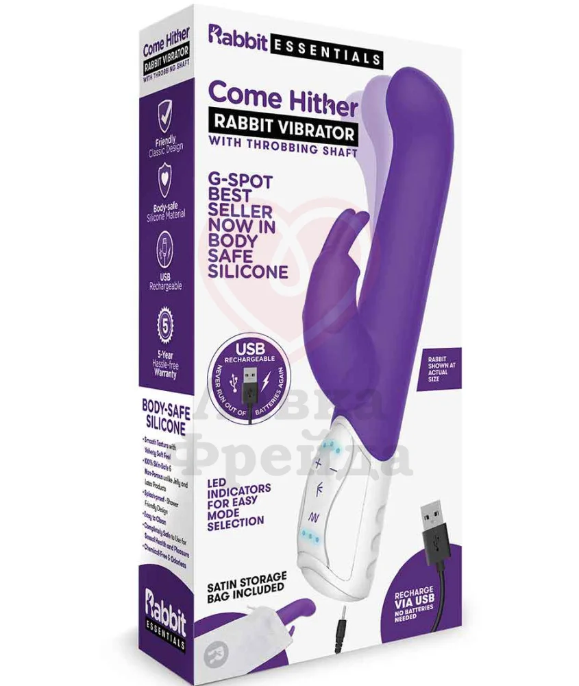 Вибратор-кролик Come Hither G-Spot Rabbit имеет изогнутую головку на основном стволе, которая совершает ритмичные движения, эффективно стимулируя чувствительную зону G. Небольшой отросток с ушками ласкает клитор вибрациями, усиливая наслаждение от игры. Режим работы контролируется кнопками на LED-панели, расположенной на корпусе аксессуара. Заряжается через идущий в комплекте USB кабель. Можно использовать с лубрикантами на водной основе. Мыть водой с добавлением мягкого мыла или обрабатывать специальным спреем для игрушек.