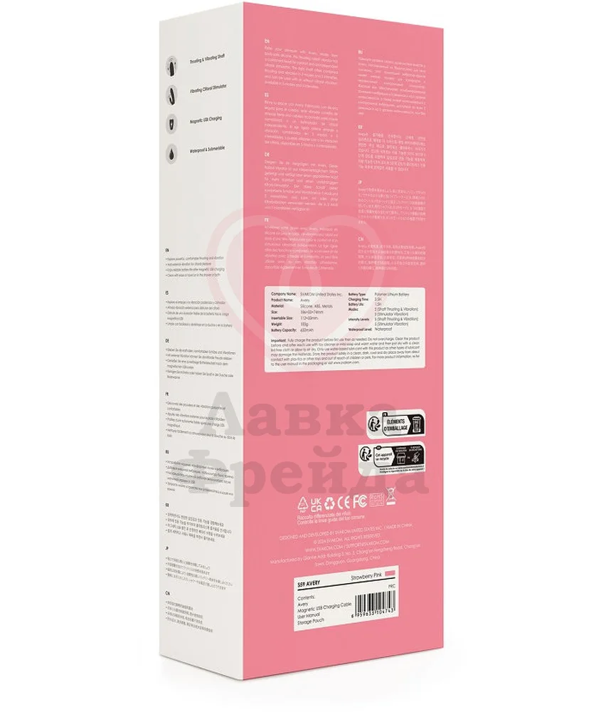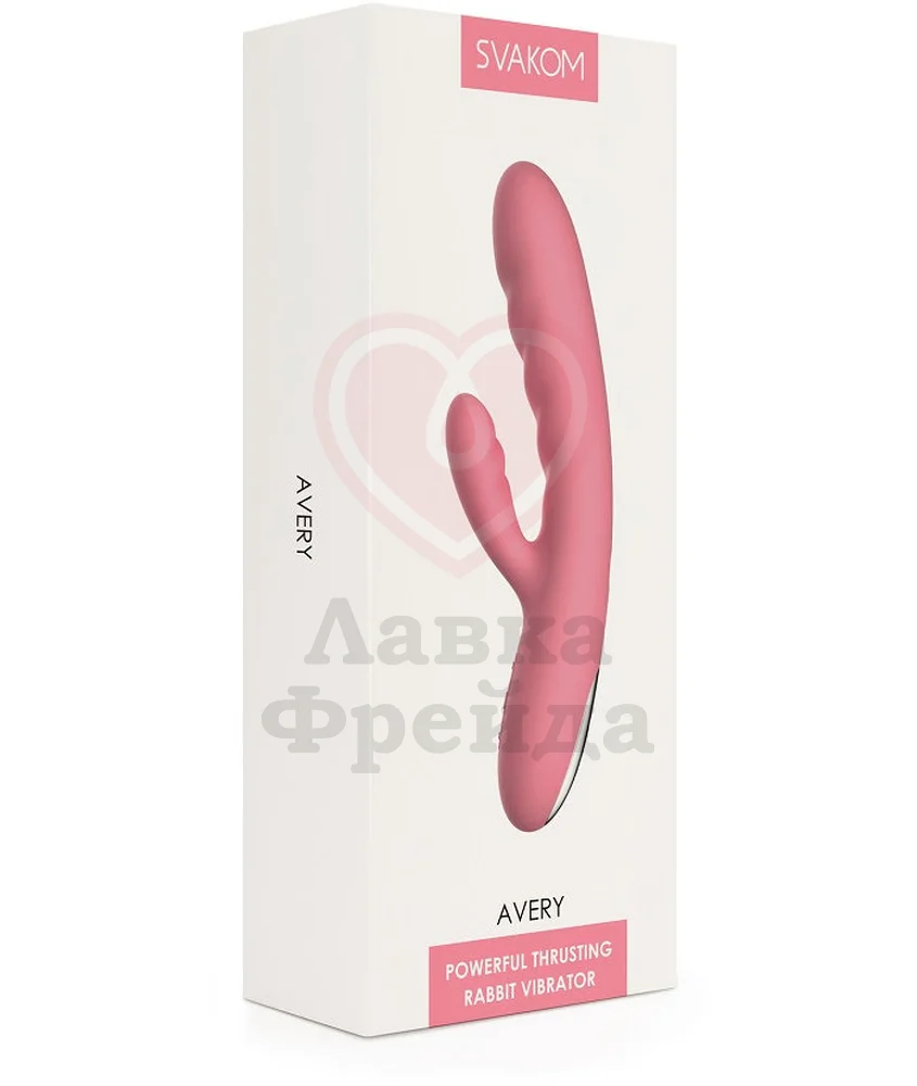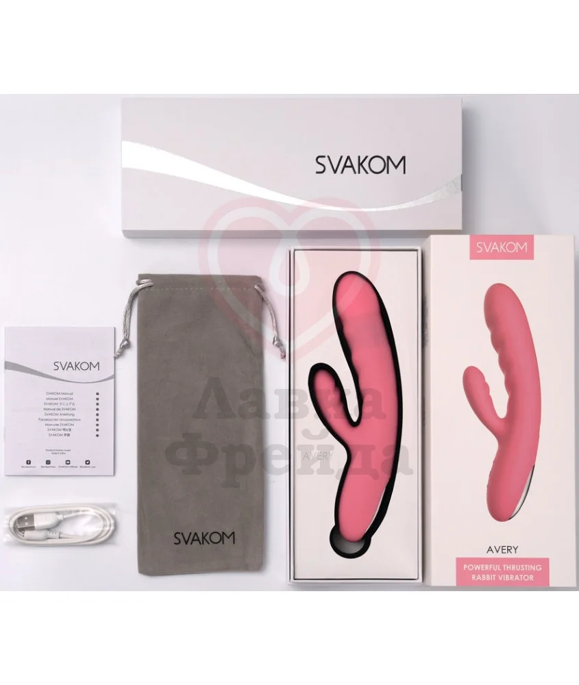 Svakom Avery предоставляет два кончика и две функции в одной игрушке для вашего удовольствия. Вибратор выполнен в классическом стиле — вагинальный и клиторальный отростки предназначены для одновременной стимуляции и наиболее ярких оргазмов.