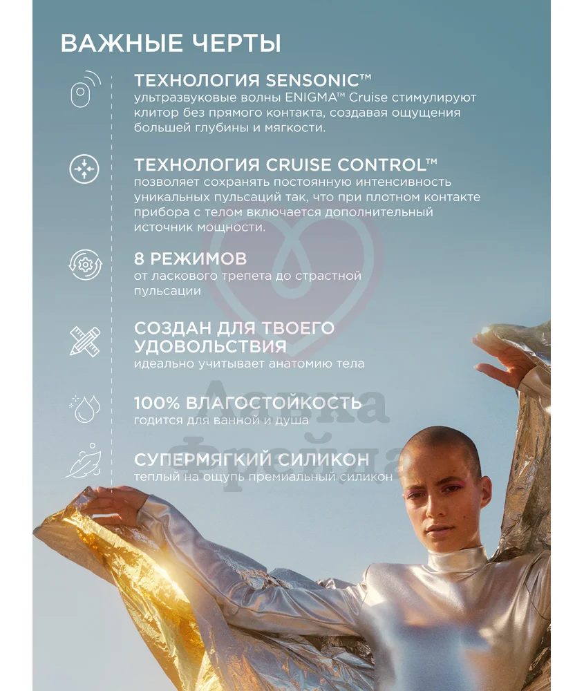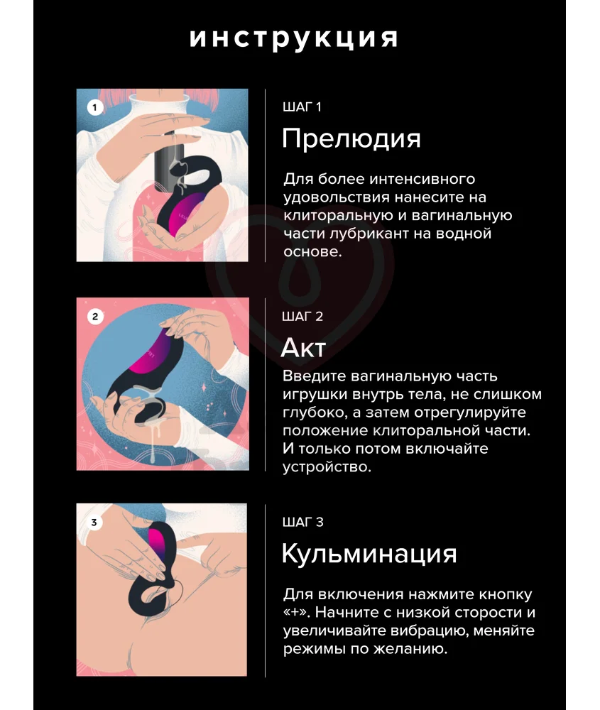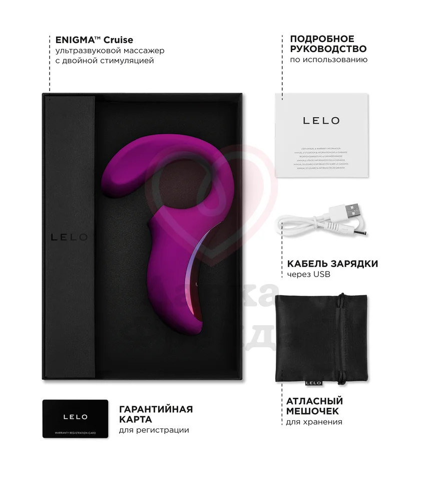 Исследуйте приятные возможности своего тела вместе с Lelo Enigma! При использовании добавляйте лубрикант на водной основе. Расположите игрушку, чтобы вам было удобно: сначала введите вагинальный кончик, а затем приложить раструб стимулятора к головке клитора. Вы также можете взять игрушку с собой в ванну или душ, так как она полностью водонепроницаема. Очищайте её после применения с дополнительными средствами.
