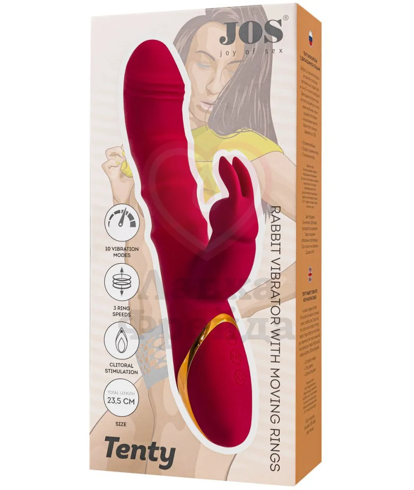 Проникающая часть вибратора Jos Tenty имеет фактурную головку с лёгким изгибом, которая будет точечно стимулировать зону G, и объёмные подвижные кольца, совершающие ритмичные фрикции вверх-вниз, работающие на 3-х скоростях. Клиторальный отросток, дополненный двумя деликатными ушками, мягко касается самых чувствительных точек, усиливая наслаждение от 10 вибро-режимов.