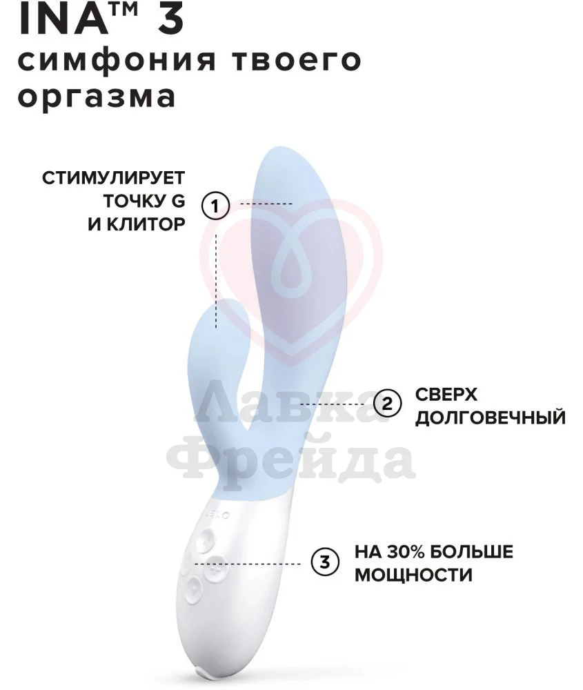 Вибратор Ina 3 доставляет удовольствие сразу двум самым чувствительным эрогенным женским зонам: клитору и точке G. Для этого он имеет два независимых мощных моторчика: один в гибком основании, другой в меньшей части вибратора для стимуляции клитора. Они создают 10 различных режимов вибрации.