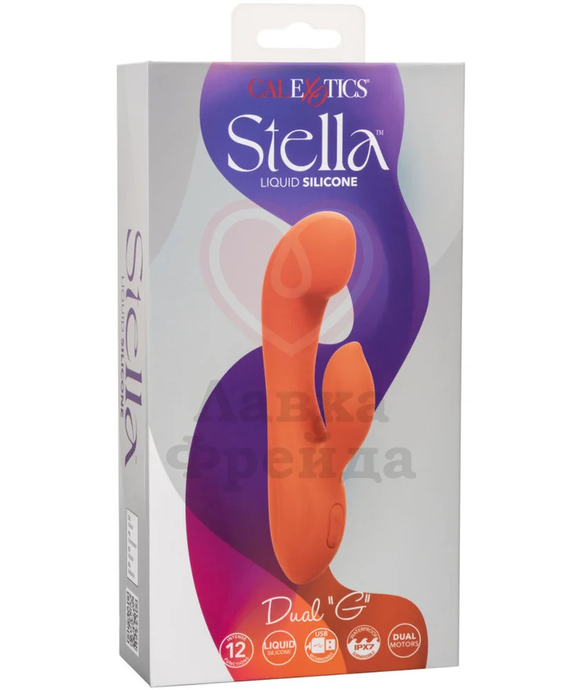 Вибратор для двойной стимуляции Stella Liquid Silicone Dual G обладает гибкими и широкими кончиками для самых ярких ощущений. Вагинальный отросток, длиной проникновения 11,5 см, заканчивается загнутым и объемным кончиком с максимальным диаметром 3,7 см. Его дополняет клиторальный лепесток для дополнительной стимуляции головки клитора. У каждого кончика внутри свой мотор — всего 12 режимов вибрации, которые переключаются одной кнопкой на ручке игрушки.