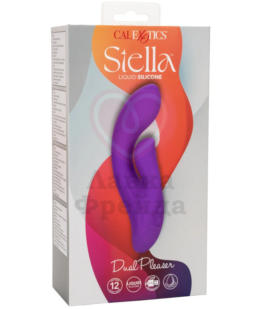 Stella Liquid Silicone Dual Pleaser — вибратор с двумя кончиками для одновременной стимуляции зоны G и клитора. Особый дизайн имеет вагинальный отросток с заметными изгибом, чтобы оказывать воздействие на самую чувствительную точку. Длина проникновения составит 9,5 см, а максимальный диаметр 3,3 см. Оба мотора имеют 12 режимов вибрации, которая управляется одной кнопкой — быстро, просто и понятно.
