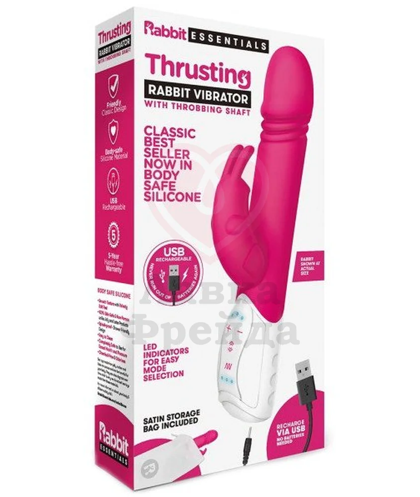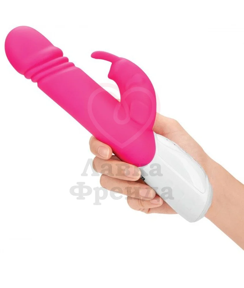 У розового вибратора-кролика Thrusting Rabbit Vibrator, как это часто принято, целых два мотора: один расположен в клиторальной части, а вот другой непосредственно в кончике игрушки для ещё более яркой стимуляции зоны G. Дизайн выполнен в несколько реалистичном виде: выраженная головка и дополнительная ребристая поверхность для особенно приятных ощущений.