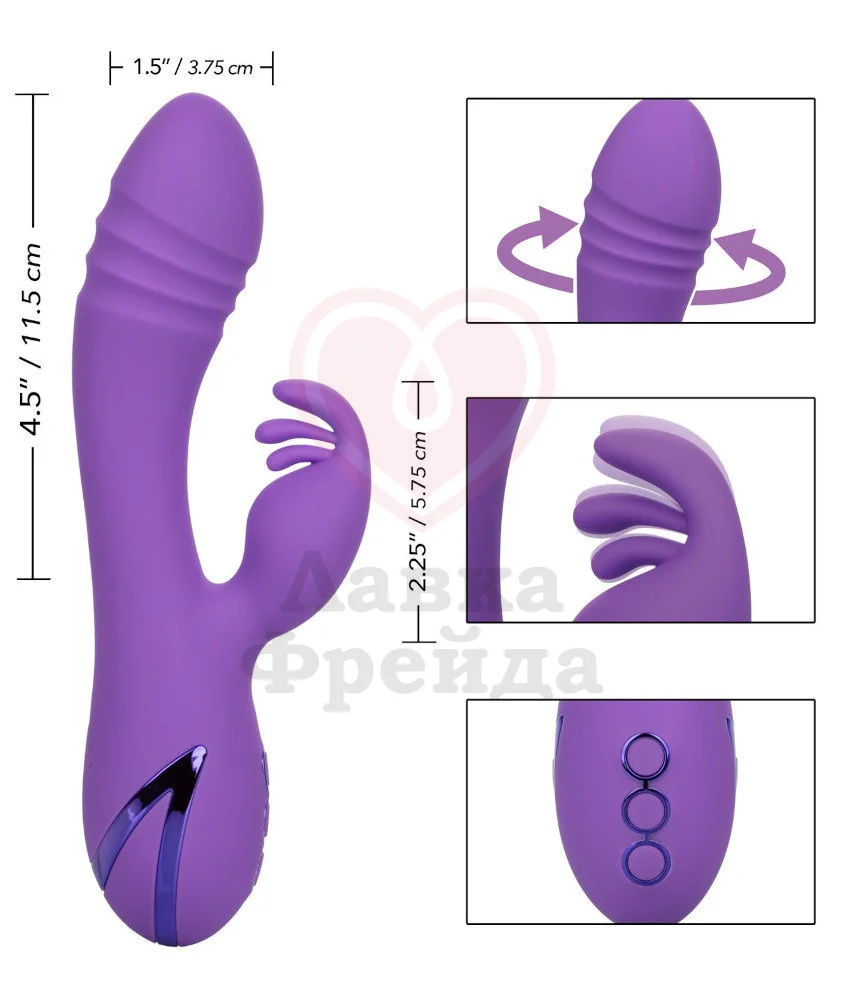 Маленький клиторальный отросток с тремя ловкими язычками составят компанию основной части игрушки. Эта гибкая часть длиной 5,7 см и шириной 2,5 см порадует 10 разными режимами вибрации и окажет потрясающую внешнюю стимуляцию для клитора. Обе функции управляются отдельно при помощи кнопок на ручке. Добавляйте при использовании лубрикант на водной основе, а очищайте с водой, мягким мылом и специальными средствами для игрушек.